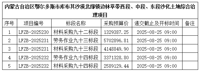 內(nèi)蒙古利凡工程項(xiàng)目管理有限公司受鄂爾多斯市水投惠源建設(shè)有限公司的委托,采用比選的方式,對(duì)內(nèi)蒙古自治區(qū)鄂爾多斯市庫(kù)布其沙漠北緣鎖邊林草帶西段、中段、東段沙化土地綜合治理項(xiàng)目--勞務(wù)作業(yè)、材料采購(gòu)5個(gè)標(biāo)段進(jìn)行采購(gòu),歡迎符合資格條件的應(yīng)選人前來(lái)參加:
